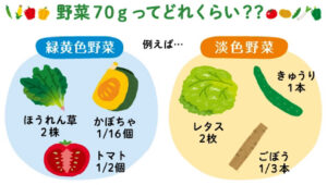 和食もお野菜を沢山とるイメージはあるのですが、実際には日本で野菜や果物を食べている量は世界と比較すると少ない方なのです。健康な毎日に必要な必須栄養素であるビタミン、ミネラル、食物繊維などを補給するには、1日350g〜400gの野菜を食べることが必要とされています。しかし日本人女性1日あたりの野菜摂取量は1人当たり約270gのみです。一方イタリアでは1日あたり452gとかなり差があります。以下の「野菜70gってどのくらい?」「野菜一皿分のイラスト」をご参考に日々どのくらい食べれているか振り返ってみてください。